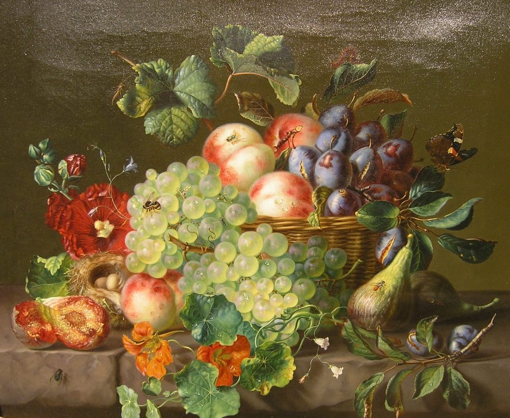 (Nr. 15, Herbststillleben mit Rosen, Wein, Mais und Vogelnest, bezeichnet unten links: A. Kaercher 1855, Farbtafel X)
