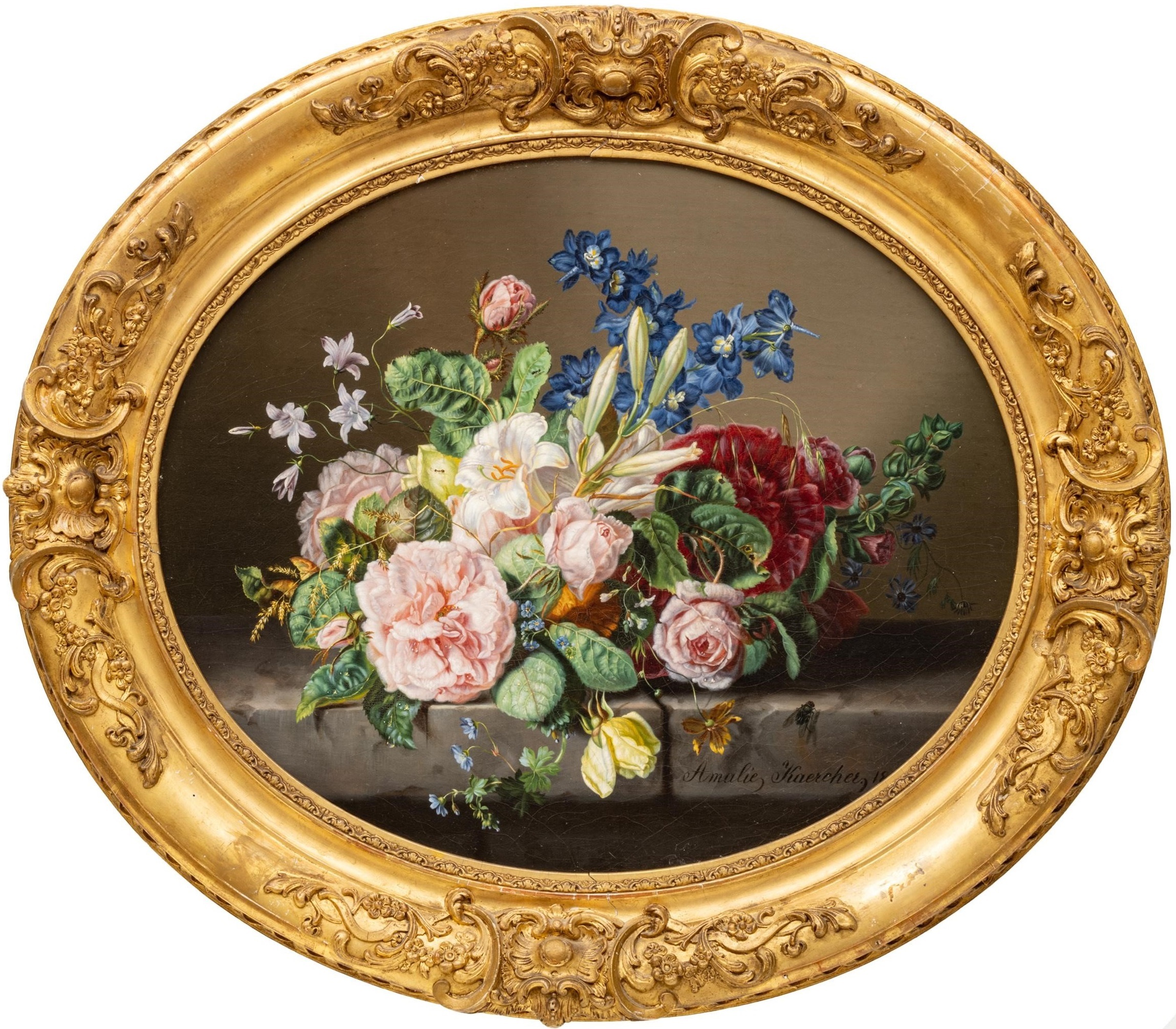 Um diese Ausbildung als Blumen- und Stilllebenmalerin zu vervollkommnen, kopierte die Künstlerin in der Großherzoglichen Kunsthalle in Karlsruhe nach Vorlagen des Künstlers Charles William de Hamilton, der in der Sammlung noch heute mit zahlreichen Ölstudien nach Blumen, Früchten und Vögeln vertreten ist. Der Vater von Amalie Kärcher bat in einem Brief vom 3. Februar 1843 an die Großherzogliche Hofverwaltung um die Erlaubnis, dass seine Tochter eine seiner Studien zum Kopieren nach Hause nehmen dürfe, weil die Galerie im Winter geschlossen sei und sie ihre Studien deshalb unterbrechen müsse.[16] Der Verwaltungsrat beauftragte daraufhin wenige Tage später den damaligen Galeriedirektor Carl Ludwig Frommel dem Professor Kärcher mitzuteilen, dass dem gestellten Gesuch nicht stattgegeben werde.[17]