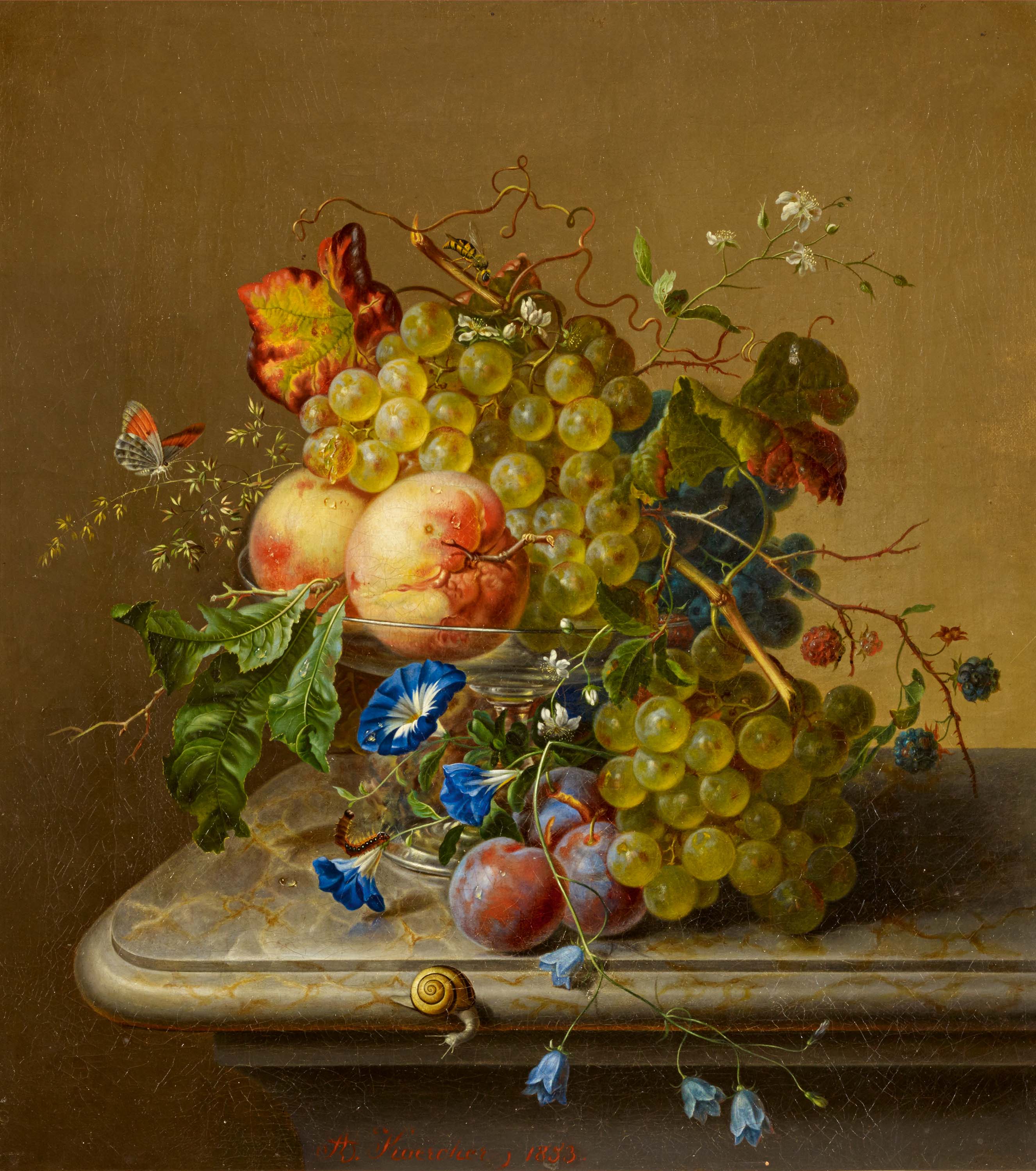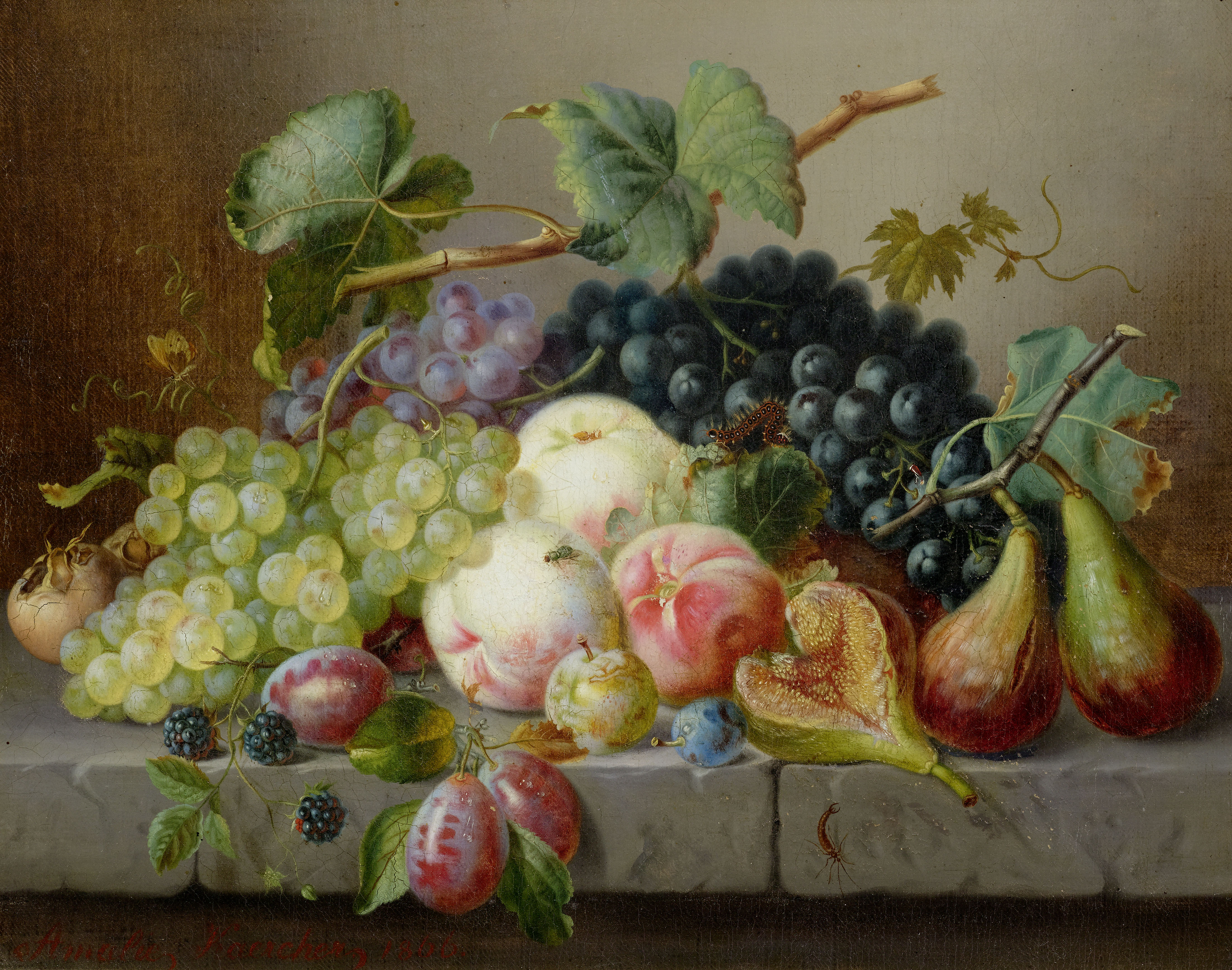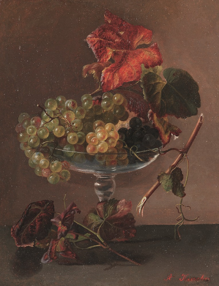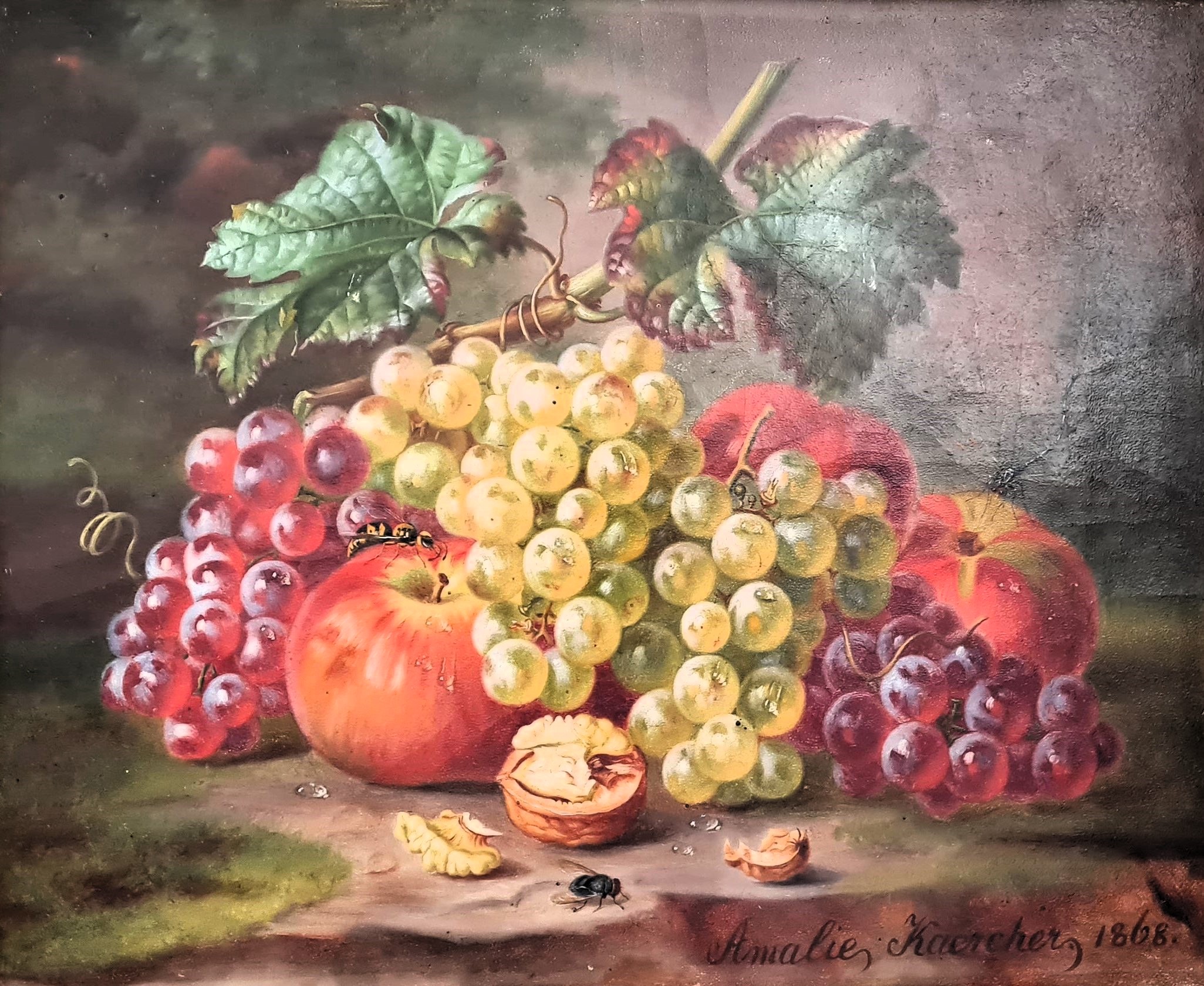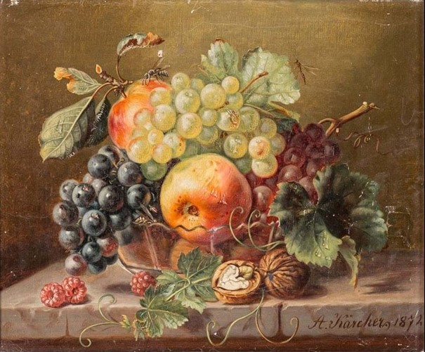 (Stillleben mit Trauben und Pfirsichen in einer Glasschale, 1853, signiert datiert unten mittig: A. Kaercher, 1853)