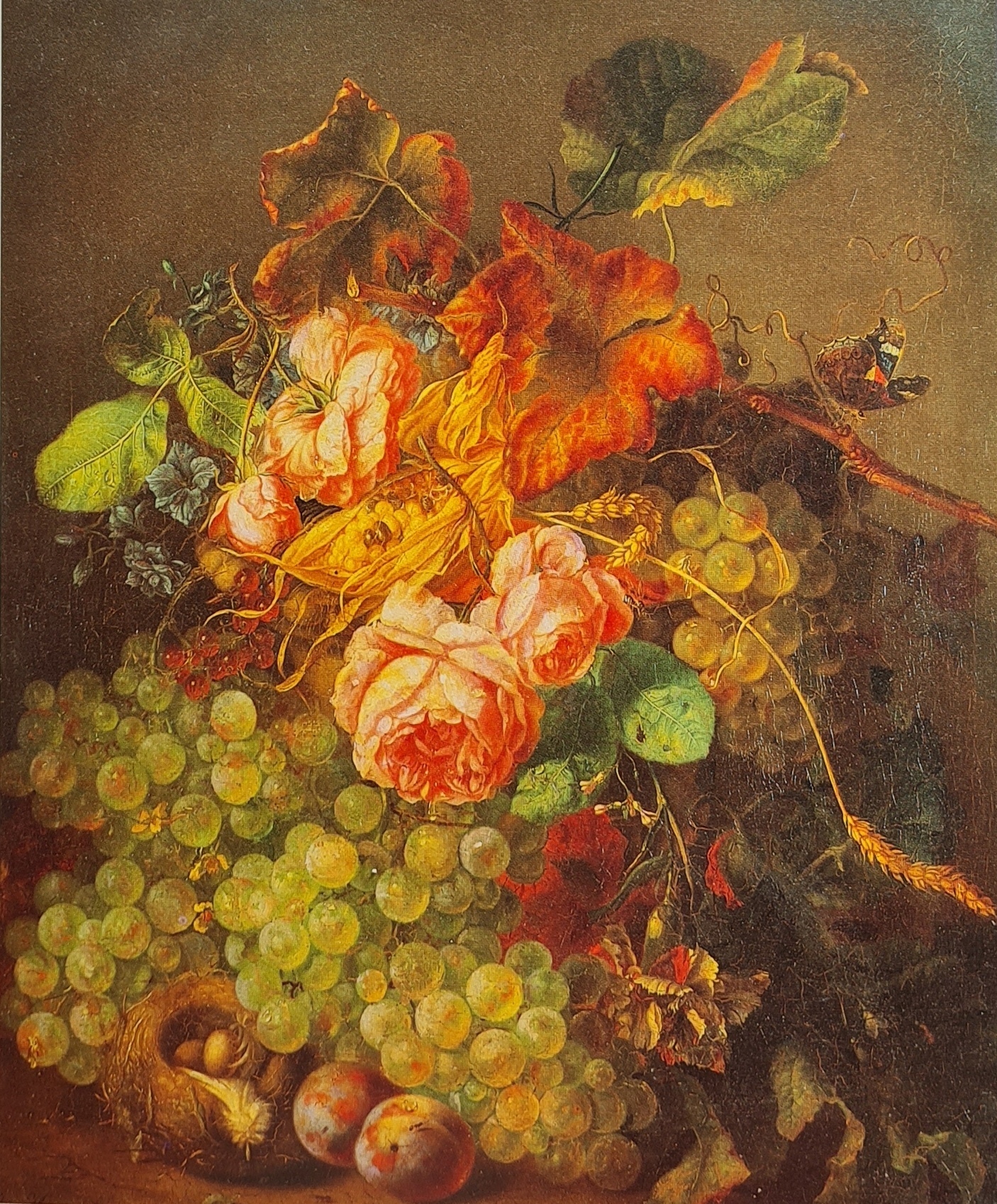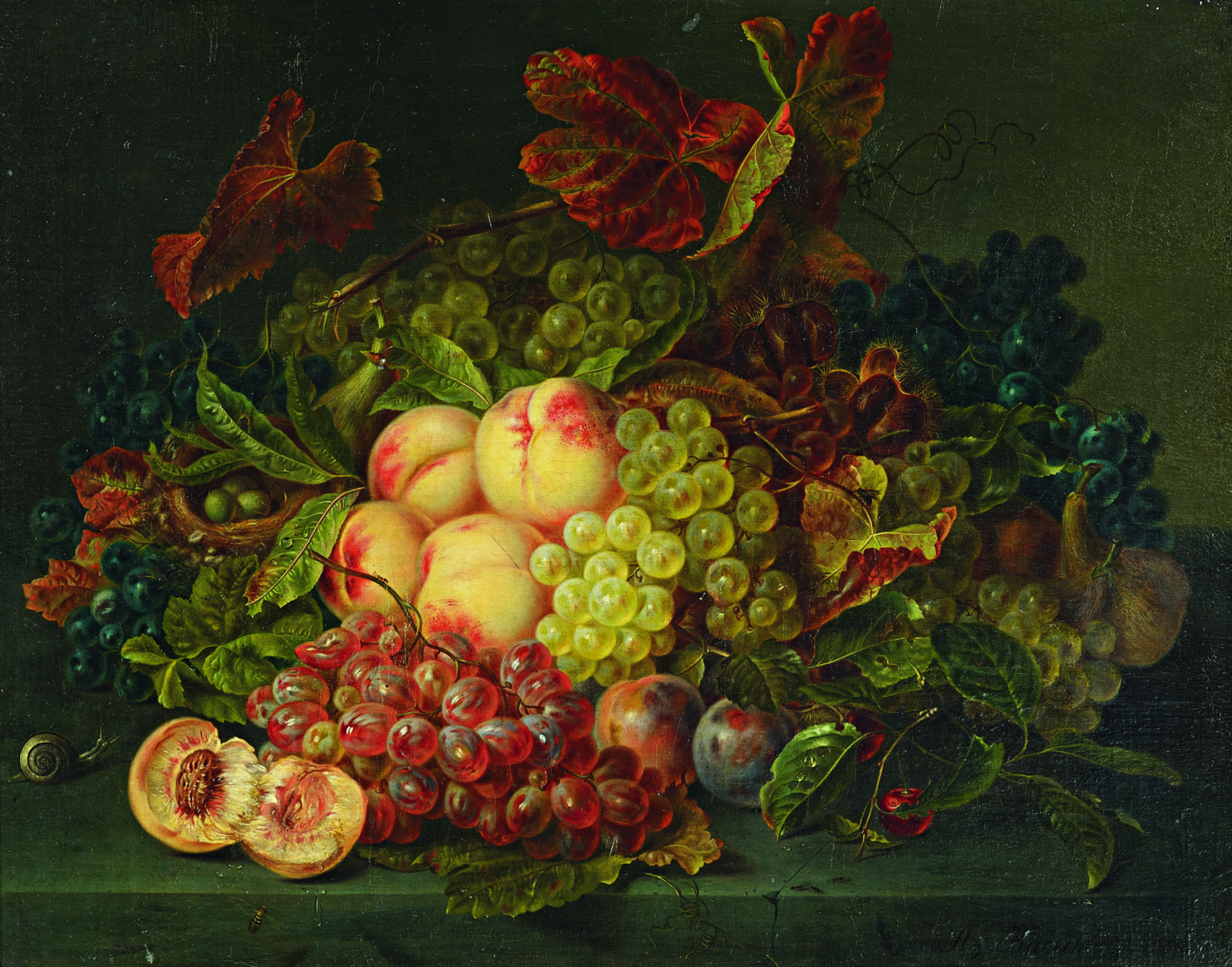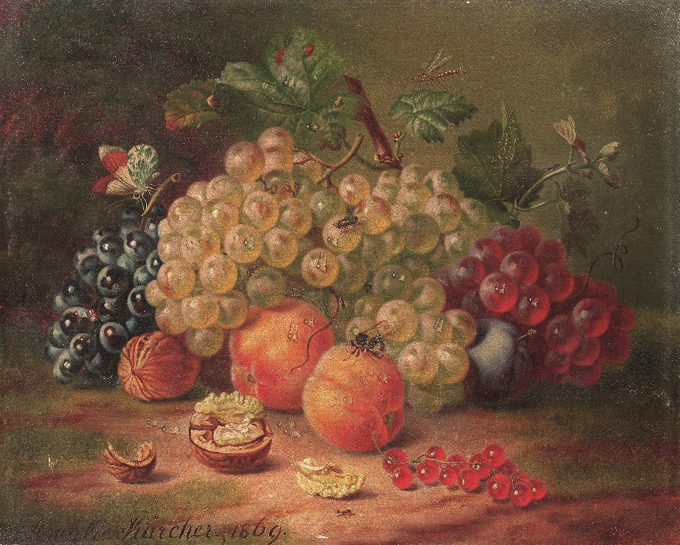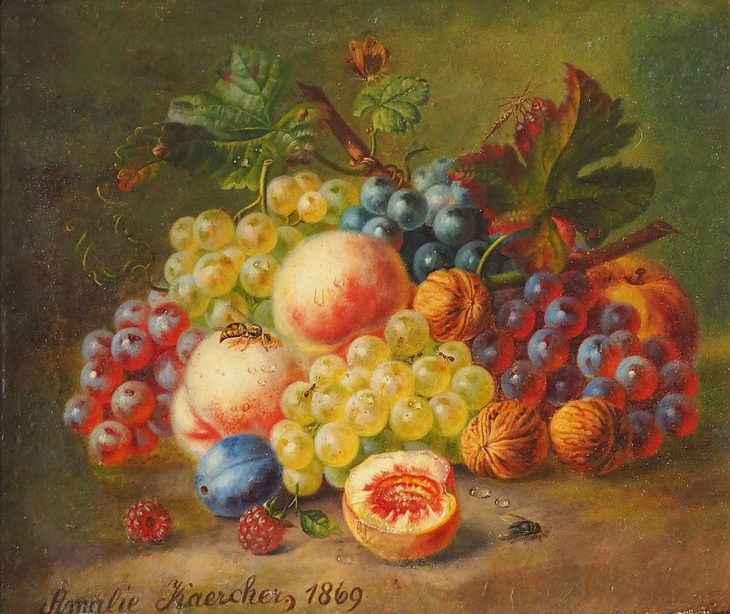 (Nr. 15, Herbststillleben mit Rosen, Wein, Mais und Vogelnest, bezeichnet unten links: A. Kaercher 1855, Farbtafel X)