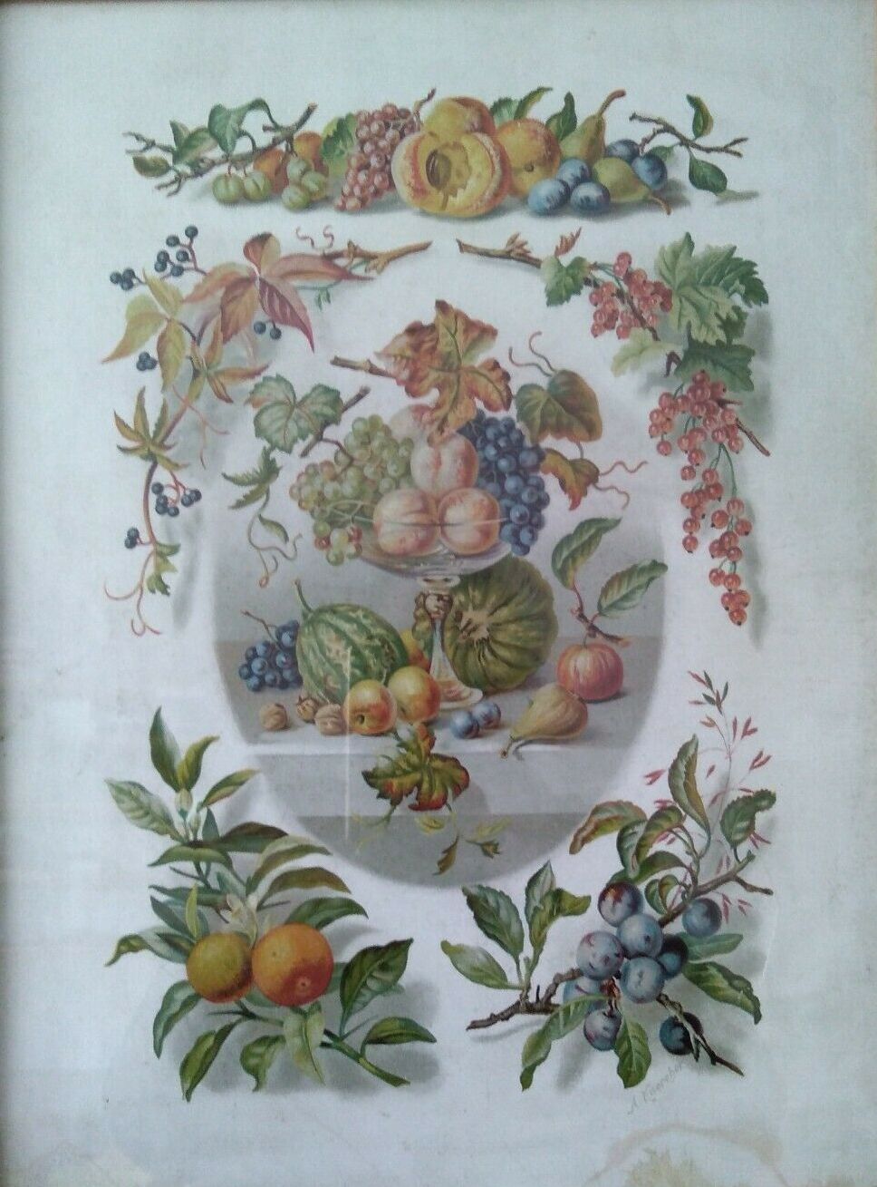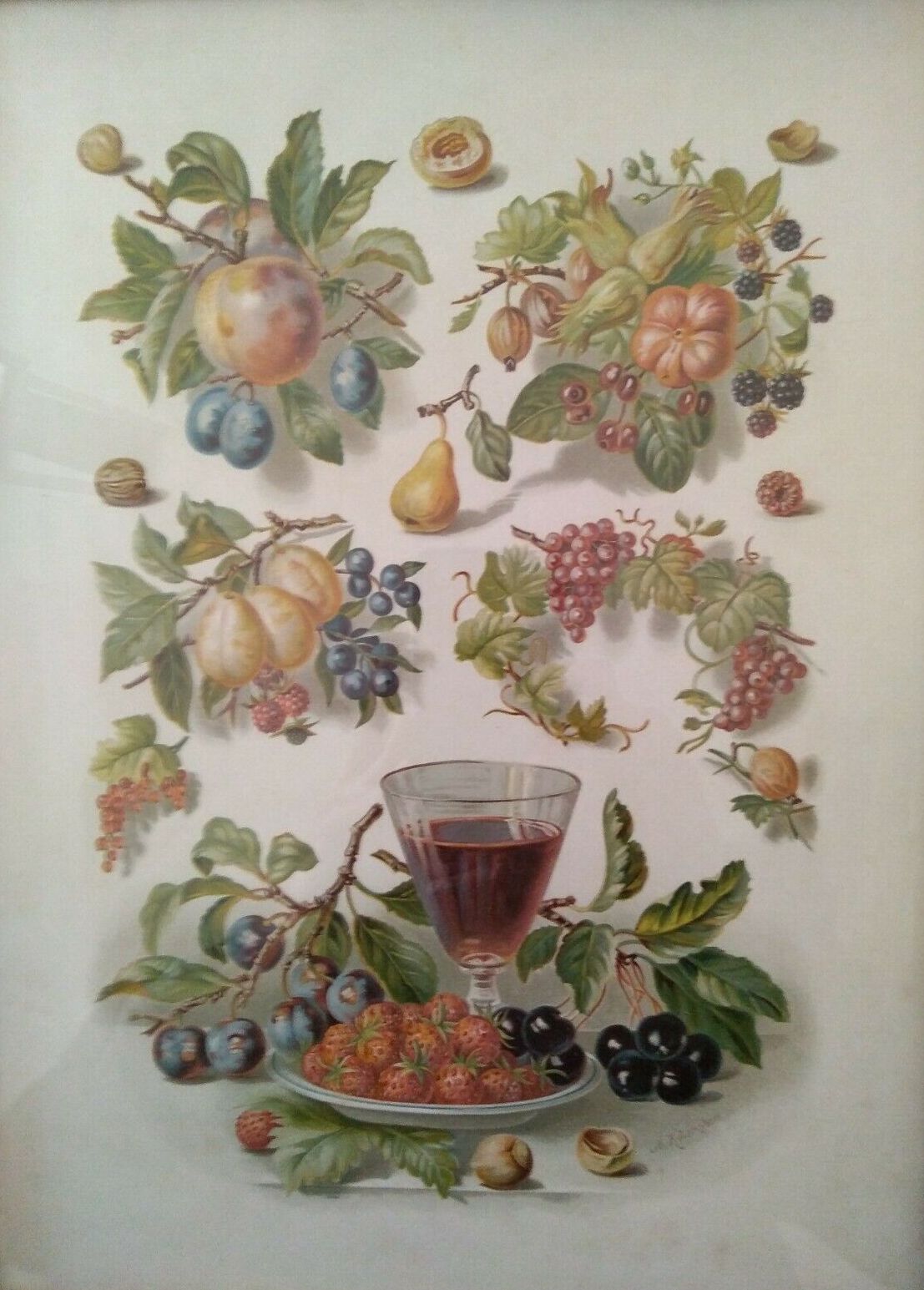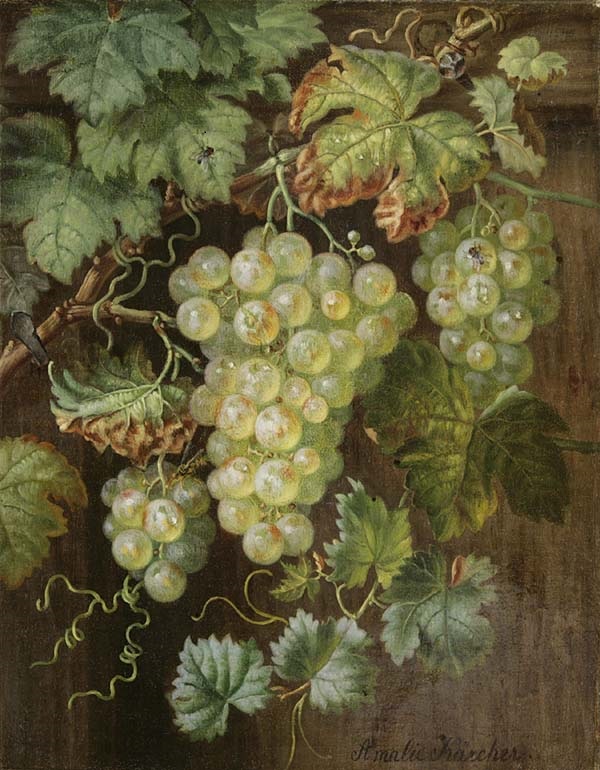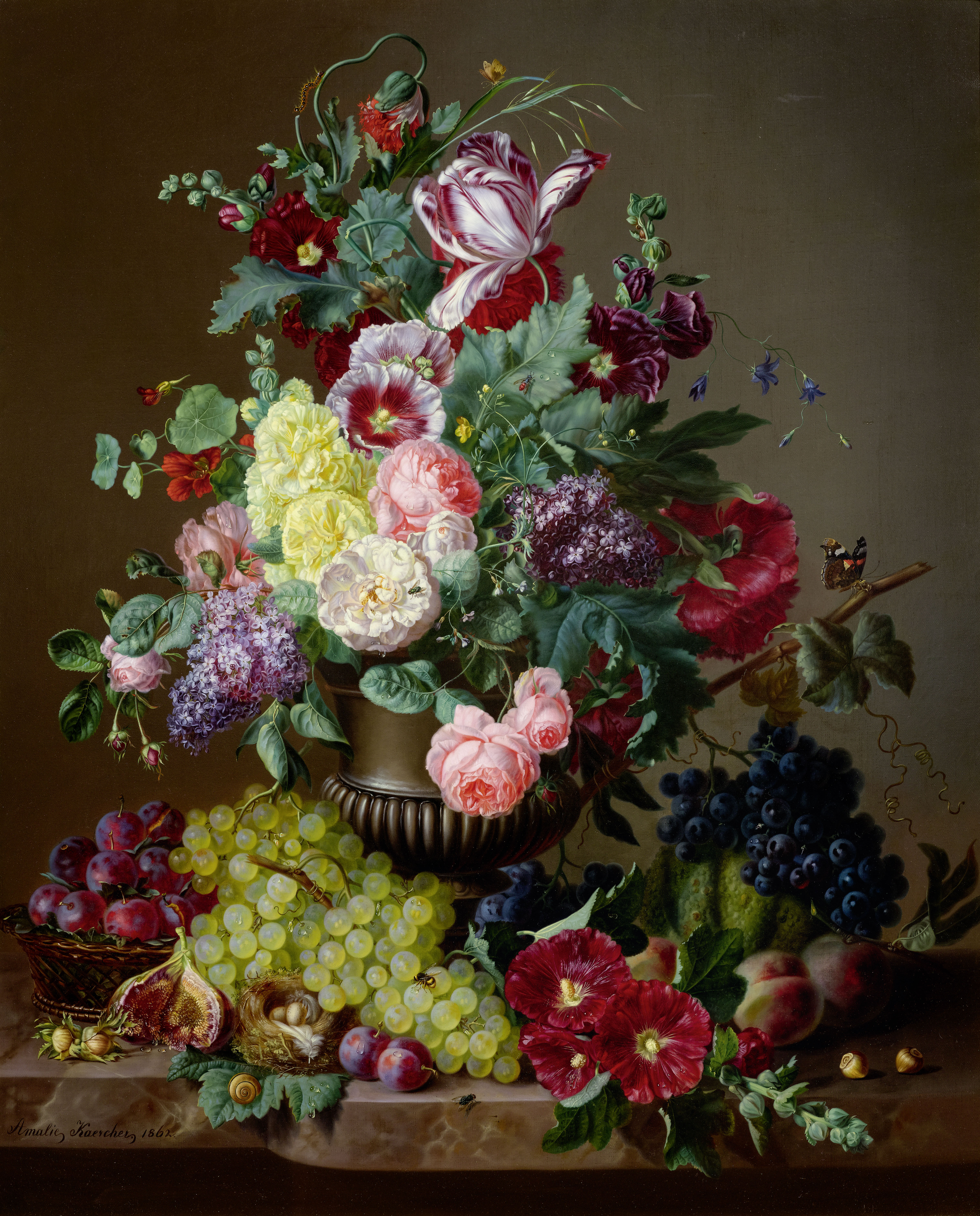 (Nr. 15, Herbststillleben mit Rosen, Wein, Mais und Vogelnest, bezeichnet unten links: A. Kaercher 1855, Farbtafel X)