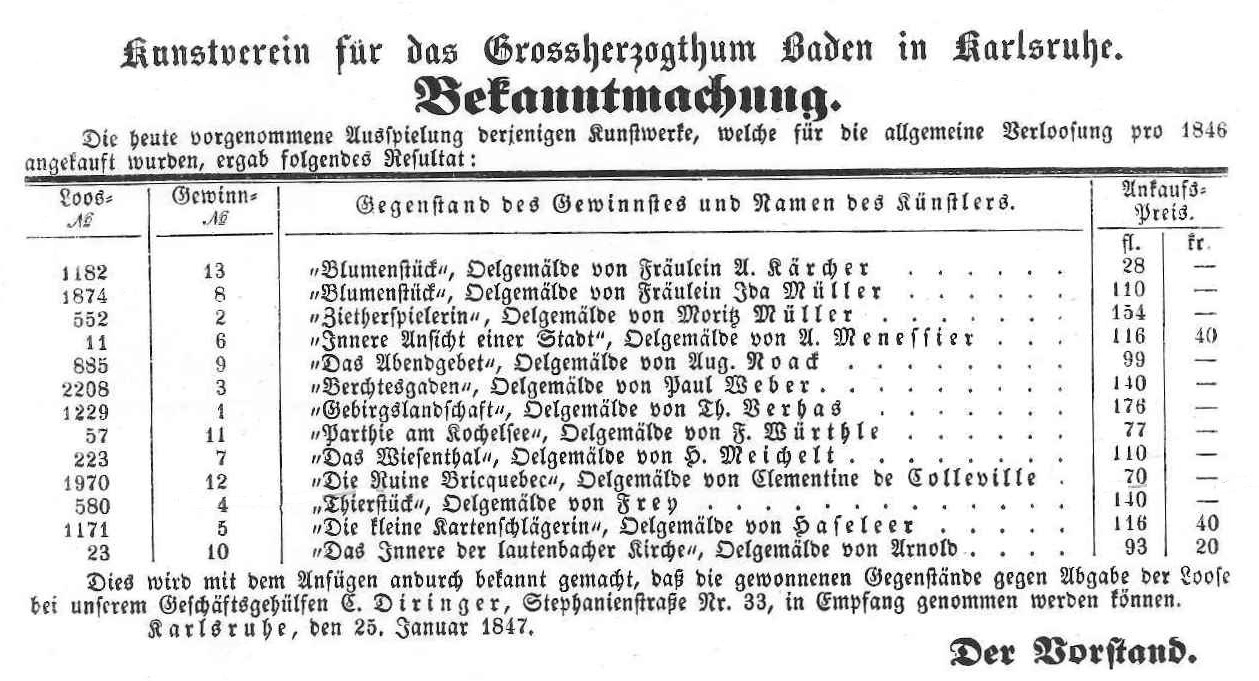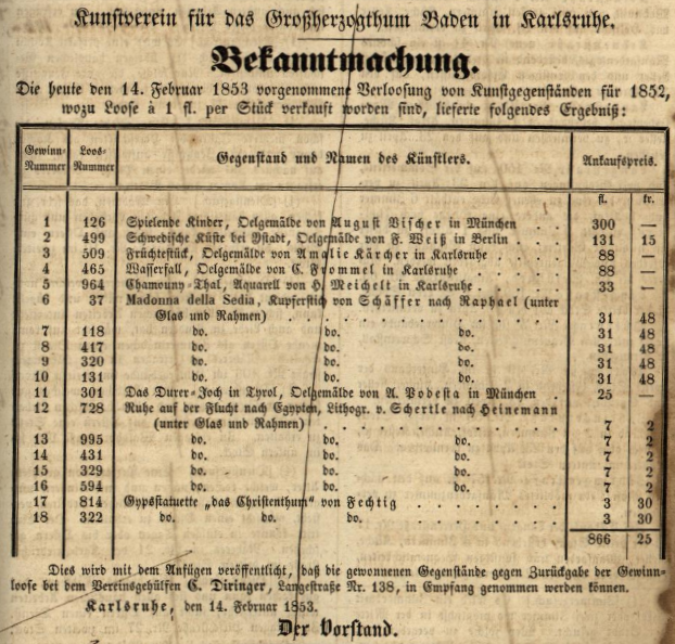 Anzeige des Karlsruher Kunstvereins über das Ergebnis der Verlosung von Kunstgegenständen im Karlsruher Tagblatt