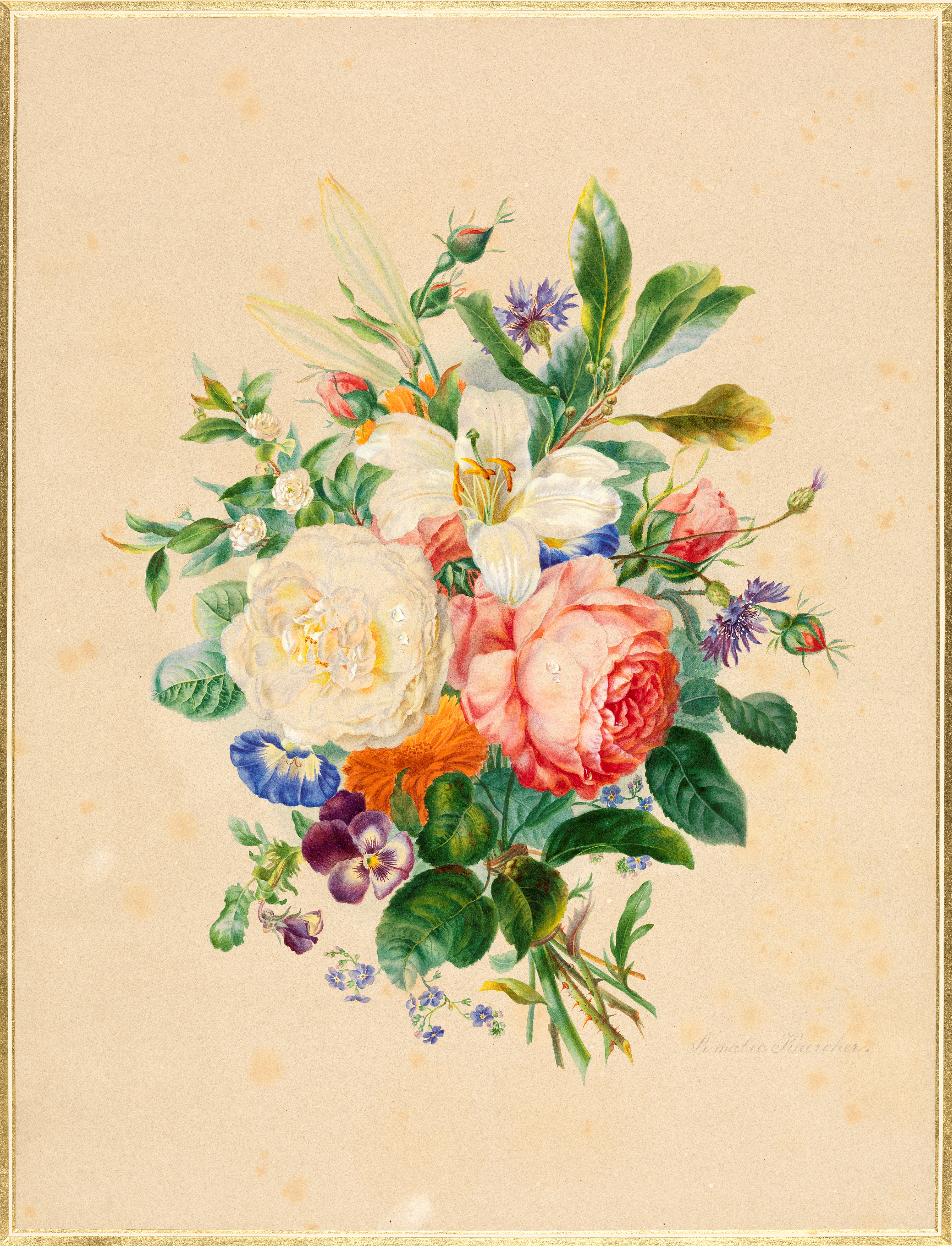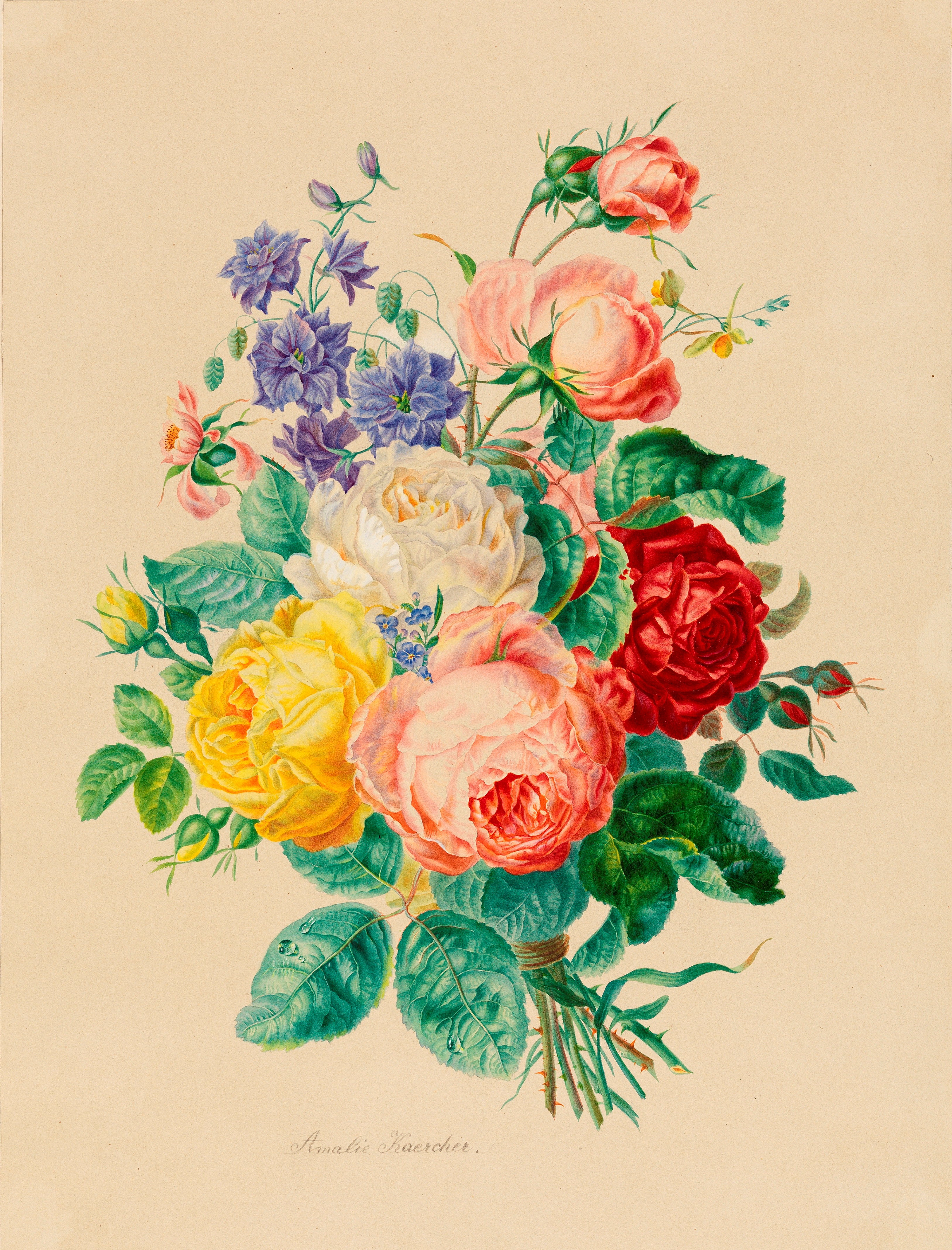 1 Schreiben von Amalie Kärcher an Münzrat Ludwig Kachel im Generallandesarchiv Karlsruhe. 2 Blumenstrauß, Blatt 41 des Heidelberger Friedrich-Luisen-Albums. Bez. u. r. neben der Darstellung Amalie Kaercher. Aquarell über Bleistift, auf beigefarbenem Papier (41,6 x 31,5 cm). Staatliche Kunsthalle Karlsruhe Inv.-Nr. VIII 1762. 3 Muss wohl April lauten, denn in ihrem Brief vom 29. April 1856 quittiert die Künstlerin den Erhalt der 55 Gulden.