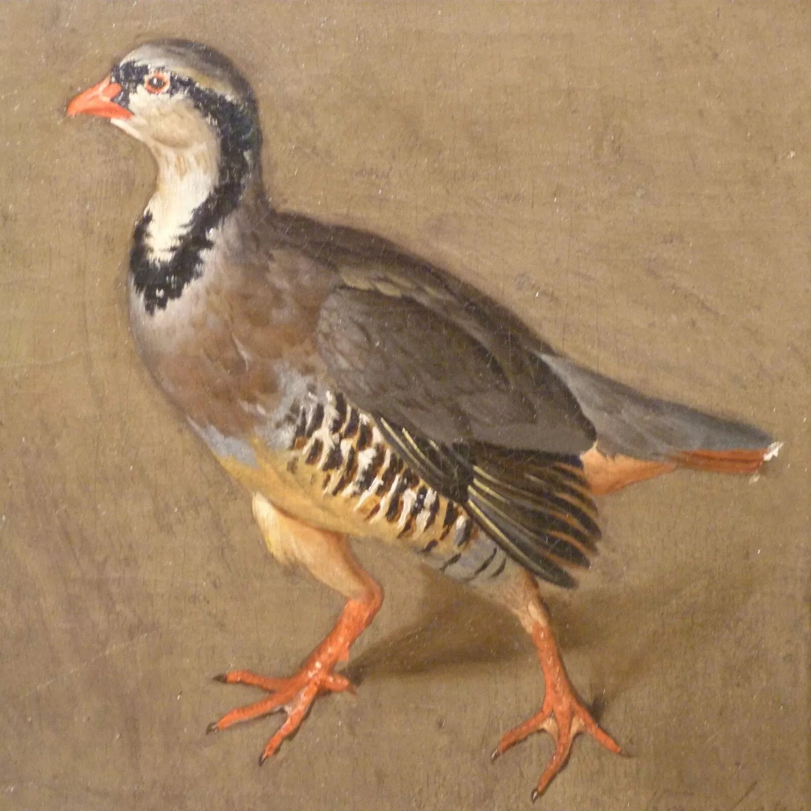 Gelbfüßiges Rebhuhn (links) und Tafelente mit ausgebreiteten Flügeln (rechts). Kopie von Amalie Kärcher (1851) nach Vorlagen der Malerfamilie de Hamilton in der Kunsthalle Karlsruhe