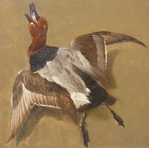 Die Farbstudie der Tafelente ist zwar nicht von Amalie Kärcher signiert, stammt aber zweifellos ebenfalls von ihr und dürfte auch nach einer Vorlage eines der Mitglieder der Hamiltonfamilie gemalt sein, welche der Künstlerin in Karlsruhe zur Verfügung stand.