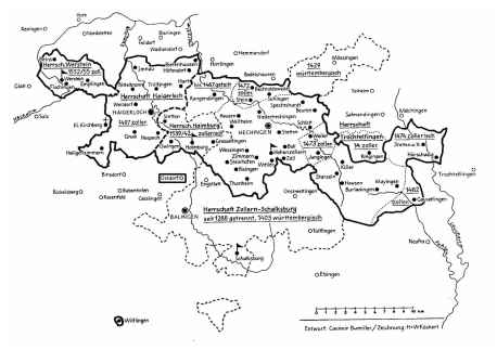 Abb. 1 Die Grafschaft Zollern und ihre territoriale Entwicklung vom 15. Jahrhundert bis 1555 (aus Bumiller, 1990)