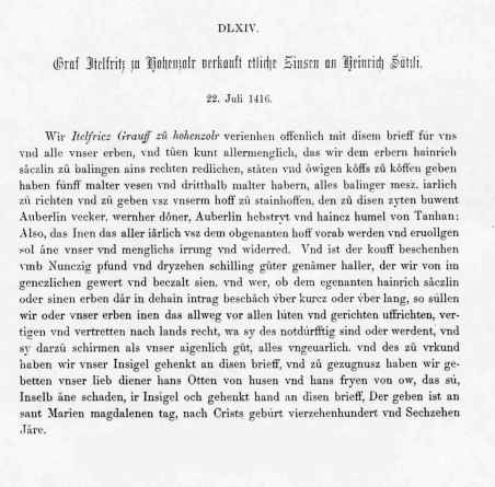 Abb. 2 Kaufurkunde aus dem Jahre 1416 (aus Monumenta Zollerana, Bd. I, Original im Württembergischen Staatsarchiv, Stuttgart)