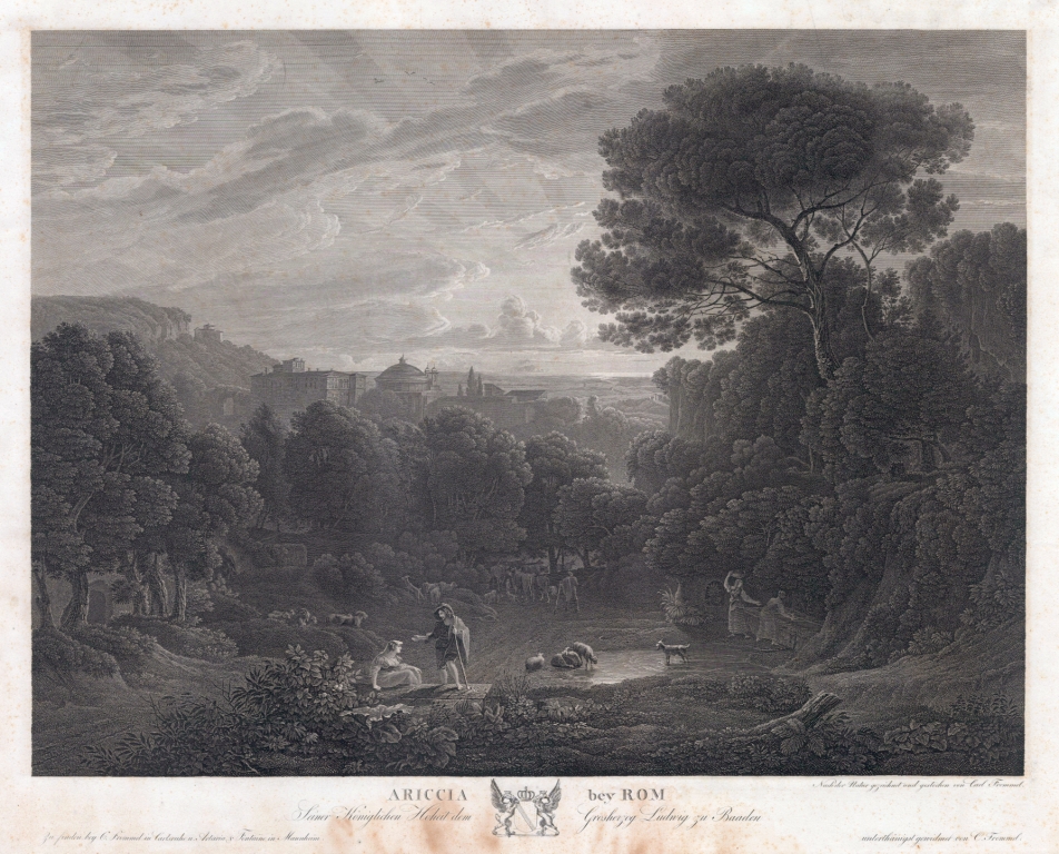 „ARICCIA bey ROM/Seiner Königlichen Hoheit dem Grossherzog Ludwig zu Baden“, Radierung von Carl Ludwig Frommel, um 1820 (Bildnachweis: E. Fecker). Die Vorzeichnung zeigte Carl Ludwig Frommel auf der ersten Ausstellung des Badischen Kunstvereins in Karlsruhe im Jahre 1818 (GLA 69 Badischer Kunstverein/1: Ariccia, Eigentum des Künstlers)