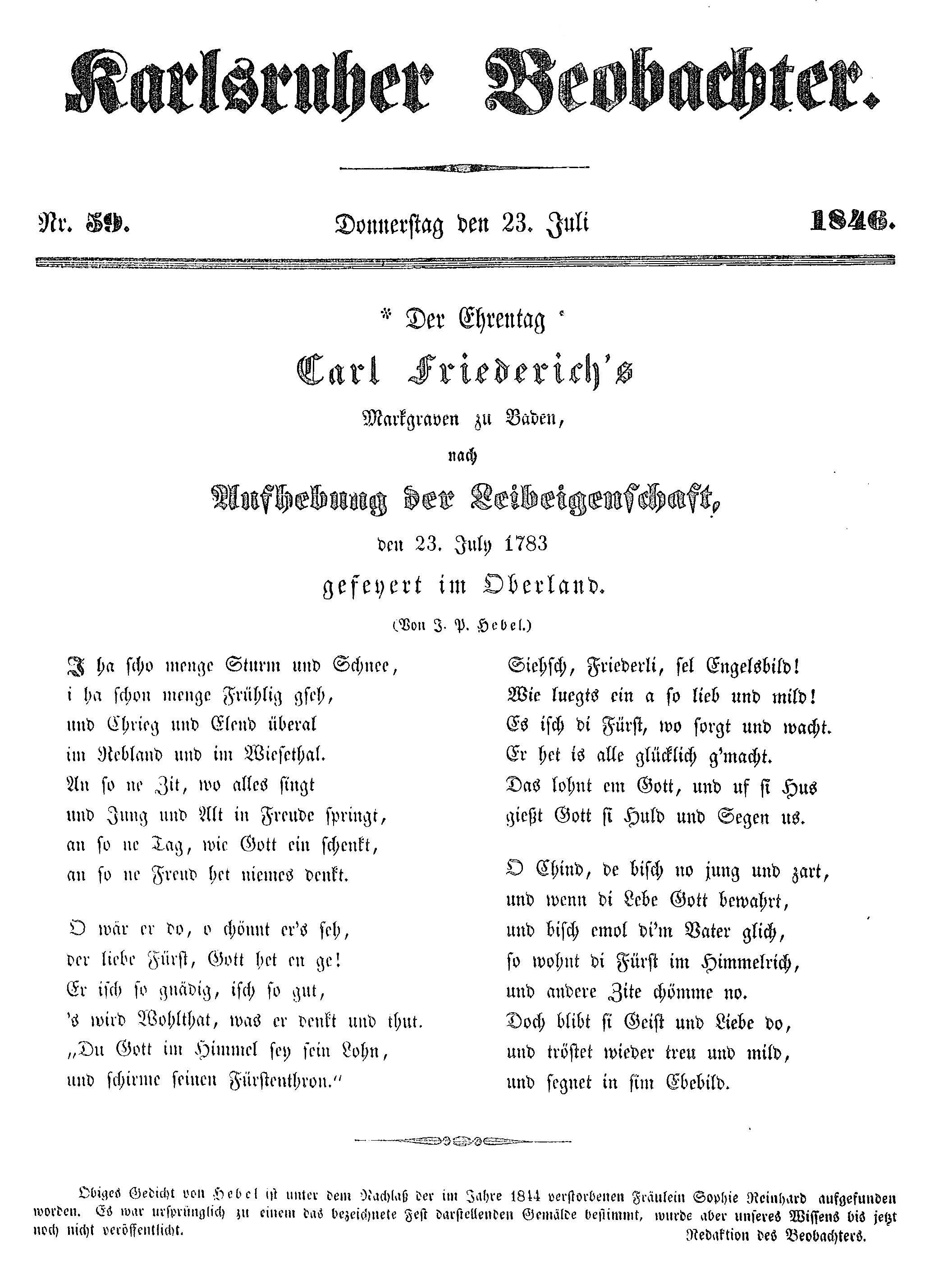 1 Laut Redaktion des Karlsruher Beobachters Gedicht von Johann Peter Hebel. Erstmals veröffentlicht im Karlsruher Beobachter, Nr. 59, 23. Juli 1846, Beilage zum Karlsruher Tagblatt (Bildnachweis: E. Fecker, vergl. auch Wilhelm Zentner (Hrsg.), Johann Peter Hebel, Gesamtausgabe, Band 3, Karlsruhe 1972, S. 220-221).