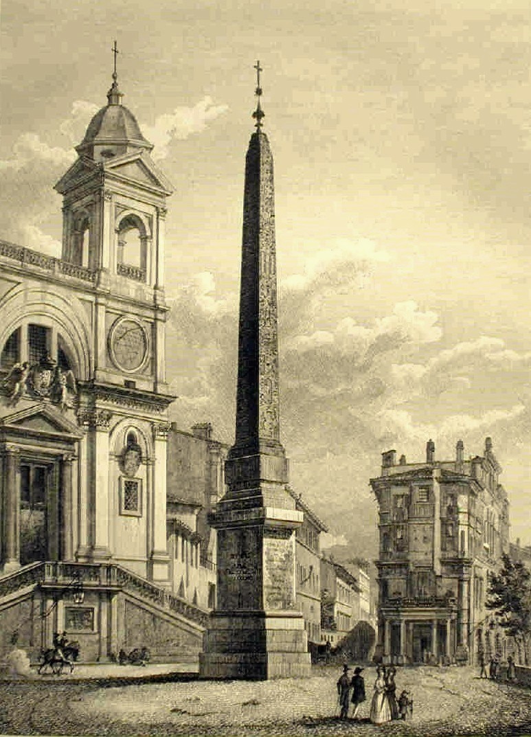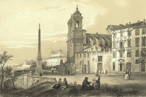 Die Familie Uexküll bewohnte auf dem Monte Pincio zwei schöne Zimmer im Haus des englischen Bildhauers, Malers und Kunsthändlers Alexander Day an der Piazza Trinità dei Monti Nr. 11, wo auch schon Johann Anton Koch gewohnt hatte.[68] Sophie Reinhard wohnte nebenan. Uexkülls Reisebegleiter Carl Urban Keller, der dort auch wohnte, hat den Ausblick von der „Casa Dai“ auf die Stadt dargestellt. Zu sehen ist der Obelisco Sallustino, der 1789 auf der Piazza Trinità dei Monti aufgestellt worden war, und der Palazzo Zuccari mit dem Porticus mit seinen vier Säulen sowie in der Ferne die Kuppel des Petersdomes.[69] Das Haus von Alexander Day schloss sich an den säkularisierten Konvent von Trinità dei Monti an, von dem es nur durch seinen Garten getrennt war.[70] An diesem Haus mündete die Via Felice, die später in Via Sistina umbenannt wurde, auf die Piazza Trinità dei Monti.