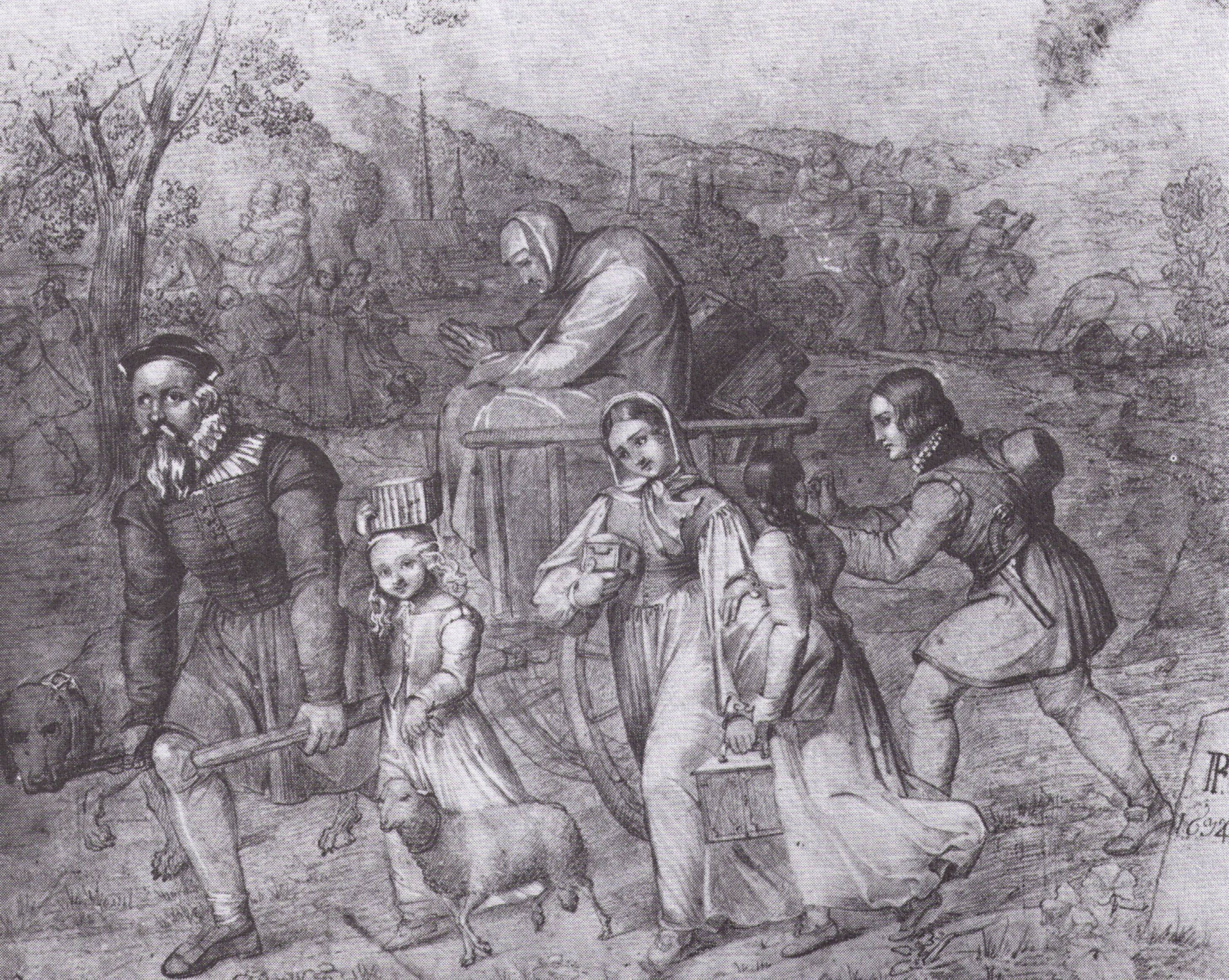 Ende August 1810 brach Sophie Reinhard zusammen mit Jakob Wilhelm Huber zu einer Reise nach Italien auf, von der sie sich neue künstlerische Anregungen versprach. Über den Verlauf dieser Reise bis nach Mailand sind wir durch den Vater der Künstlerin Maximilian Wilhelm Reinhard sehr gut informiert.[51] „Meine Tochter, die Frau meines Sohns,[52] Herr Huber ein geschickter Landschaftmaler aus Zürich, und ich fuhren in einem guten Miethwagen am 23. August 1810 früh um fünf Uhr von Karlsruhe ab, aßen in Achern zu Mittag und übernachteten in Offenburg. Bei dem angenehmen Sommerwetter und der heiteren Stimmung, in der wir uns befanden, waren wir mit diesem ersten Tag unserer Reise wohl zufrieden, ungeachtet das fruchtbare schöne Land, durch das wir fuhren, uns schon lange bekannt war, mithin uns das Vergnügen nicht gewähren konnte, das denen zu Theil wird, die in einem schlechteren Lande wohnen, und es zum erstenmal sehen.“ „Den 24. Morgens früh fuhren wir bei gleich schönem Wetter von Offenburg durch das schöne Kinzigthal an Gengenbach vorbei, bis an das Wirtembergische Städtchen Hornberg, das in einem sehr engen Thale liegt, in seinen engen Straßen kaum Platz für die sich bewegenden Wagen hat, und, wie man sagt, nebst der Herrschaft Nellenburg und einigen anderen Besitzungen, die zusammen 45.000 Einwohner enthalten, von Wirtemberg an Baden abgetreten werden soll.“[53] „Einige Stunden nach unserer ferneren Reise kamen wir nach Krummenschiltach, einer Wirtembergischen Poststation mitten im Schwarzwald. … Nachdem unsere Pferde mit etwas Brot gestärkt waren, setzten wir unsern Weg über das Wirtembergische Dorf St. Georgen fort, und kamen endlich Abends spät nach dem badischen Städtchen Villingen, wo wir in der Post unsere Herberge fanden.“[54]