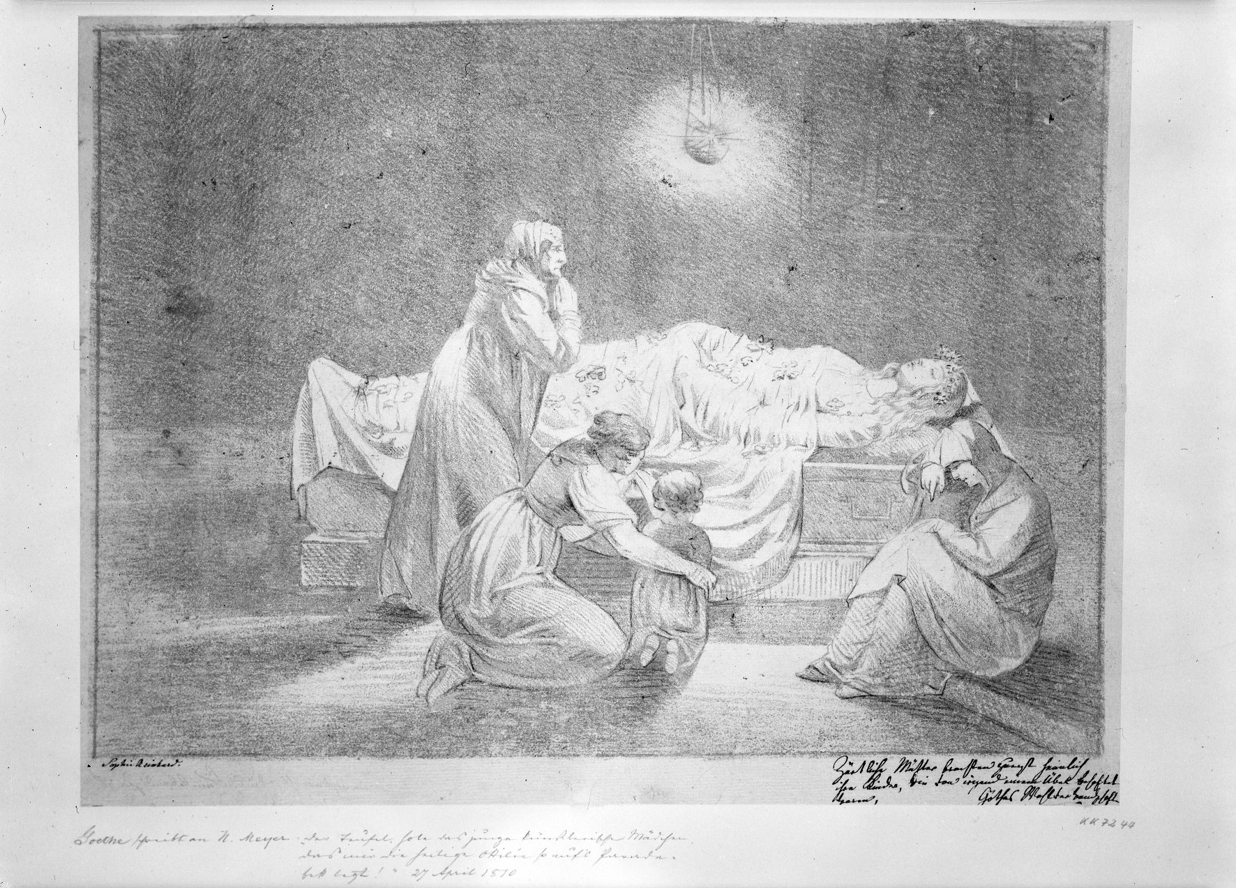 Aus Goethes Roman, der im Jahr zuvor erschienen war, griff sie die zwei dramatischen Szenen vom Ende des zweiten Teiles auf, in der einen sitzt Ottilie mit dem toten Kind im Kahn und in der anderen liegt sie auf dem Totenbett. Hofrat Heinrich Meyer schrieb am 20. April 1810 aus Weimar in einem Brief an Goethe: „Vor ein paar Tagen brachten mir Fremde aus Carlsruhe einen Brief von Weinbrenner und zugleich die beyliegenden Contradrücke von Zeichnungen, die, wie Sie sehen, ein geschicktes Mädchen daselbst (Tochter eines Geheimraths Reinhard) nach den Wahlverwandtschaften verfertigt. Sie wolle, schreibt Weinbrenner, bald nach Rom reisen, um daselbst weiter zu studieren“[47], worauf Goethe am 27. April aus Jena antwortete: „Die beyden Contradrucke folgen auch. Das gute Kind kann wohl was und könnte noch mehr lernen, aber das Schlimmste ist: sie denkt falsch wie die sämmtliche Theecompanie ihrer Zeitgenossinnen; denn in unsrer Sprache zu reden, so hole der Teufel das junge künstlerische Mädchen, das mir die heilige Ottilie schwanger aufs Paradebett legt. Sie wissen besser als ich, was ich sage. Jene können nicht vom Gemeinen und Niederträchtigen, von der Amme, von der Madonna los kommen, und dahin zerren sie alles, wenn man sie auch gelinde davon zu entfernen wünscht. Das todte, wirklich todte Kind gen Himmel zu heben, das war der Augenblick der gefaßt werden mußte, wenn man überhaupt solches Zeug zeichnen will − so wie im andern Falle in der Capelle für mahlerische Darstellung nichts gelten kann, als das Herantreten des Architekten. Aber wo sollte das Völklein, bey allem freundlichen Antheil, hernehmen, worauf es ankommt!“[48] Trotz dieser kritischen Anmerkungen ließ Goethe beide Blätter auf der Kunstausstellung 1811 in Weimar der Öffentlichkeit zeigen.[49]