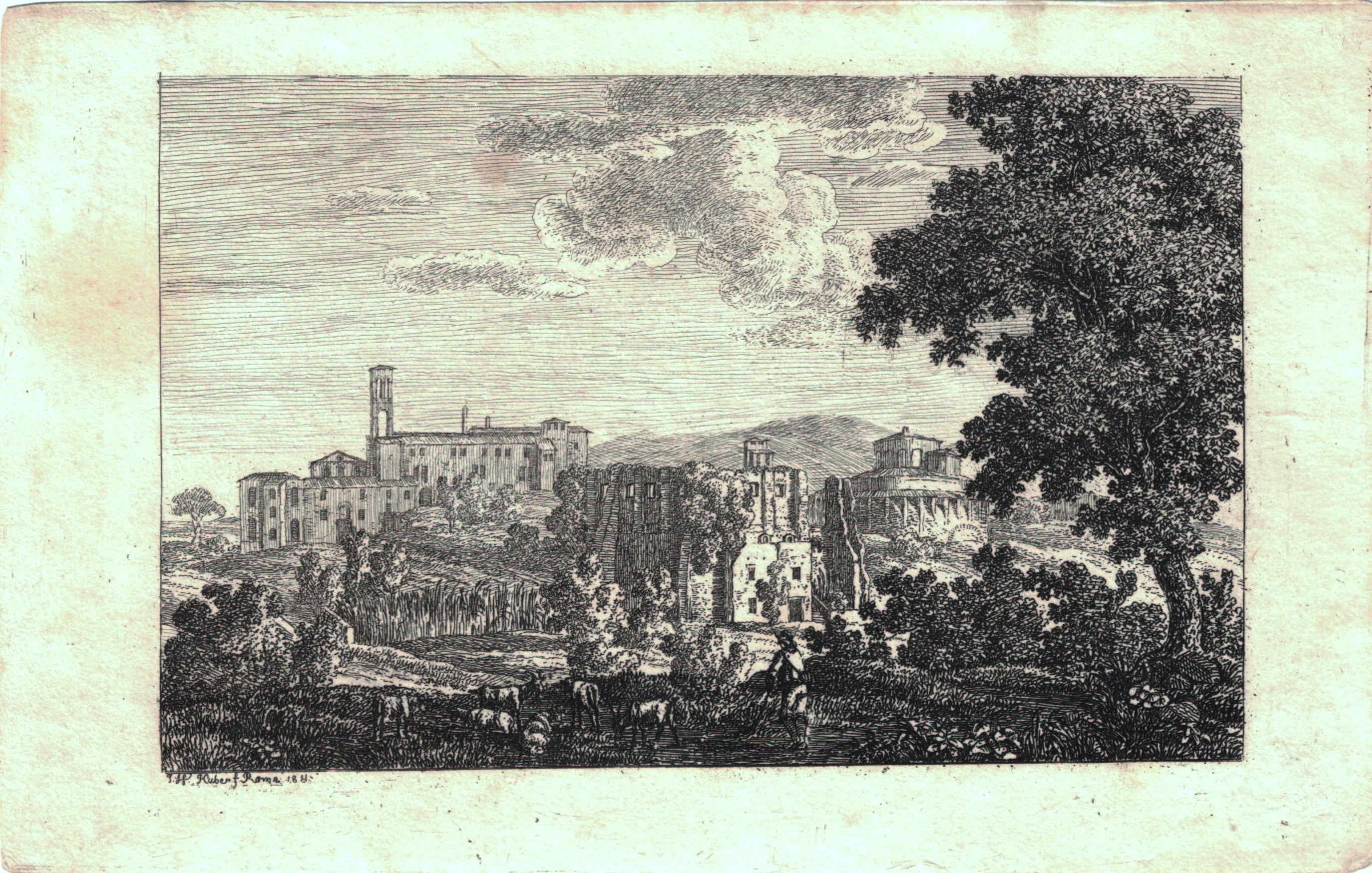 Eine der ersten Radierungen, die Jakob Wilhelm Huber in Rom angefertigt hat, wo er zusammen mit Sophie Reinhard Ende September 1810 angekommen war. Die Radierung zeigt das Kloster St. Agnese fuori le mura und ist bezeichnet: J. W. Huber f. Roma 1811