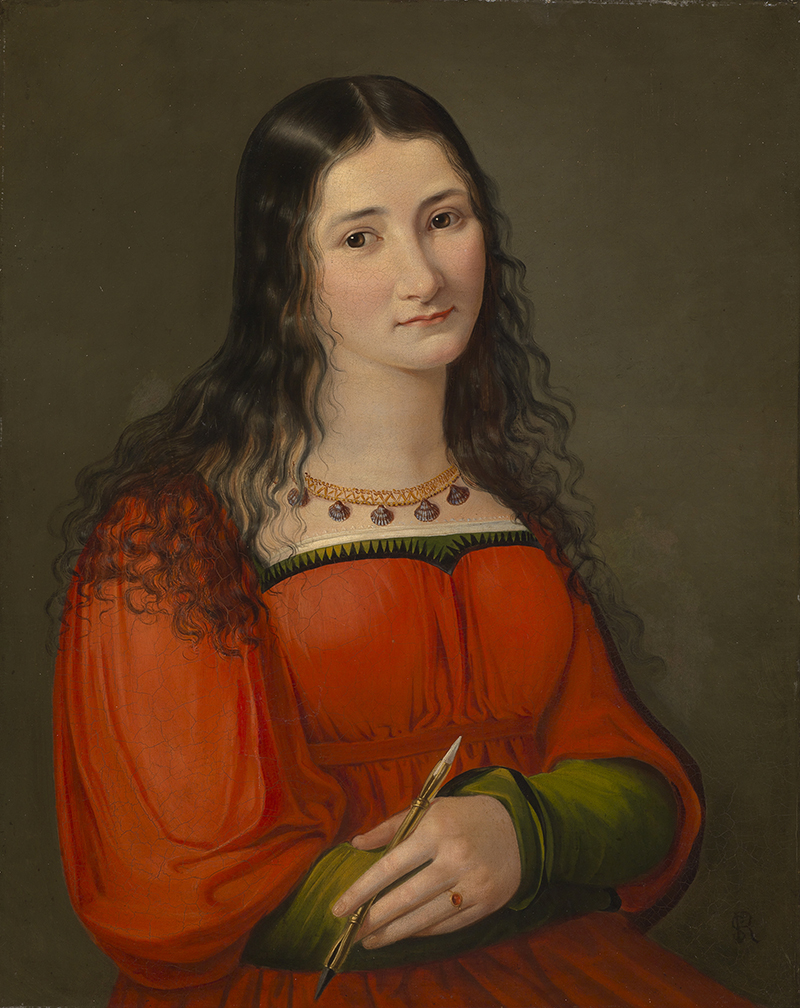 Im Katalog der Ausstellung „Zwischen Ideal und Wirklichkeit“ spricht Bärbel Kovalevski dann von einem „als »Junge Römerin« bezeichneten Selbstbildnis“, womit sich die Ansicht, es handle sich um ein Selbstbildnis der Künstlerin, verfestigte.[115] Zehn Jahre später hat sich Katrin Seibert mit diesem bedeutenden Portrait eingehend beschäftigt und kommt nach einem Vergleich mit Portraits von Sophie Reinhard zu dem Schluss, dass es sich wohl kaum um ein Selbstportrait Sophie Reinhards handeln könne. „Nachdem das vermeintliche Selbstbildnis keine Übereinstimmungen mit den anderen Portraits der Künstlerin aufweist, … und die hier Dargestellte mit ihrem wallenden Haar kaum eine Frau von 35 bis 40 Jahren sein kann, gilt es zu fragen, wer sich dahinter verbirgt? Die Dargestellte aufgrund der Tatsache, daß sie in der Linken einen Silberstift als Malerattribut hält, für Sophie Reinhard zu halten, ist problematisch.“[116] Um den Mund der Dargestellten schwebt auch kein „gewisser ironischer Zug“, den das geschulte Auge des Malers Albrecht Adam an Sophie Reinhard beobachtet hat.[117]